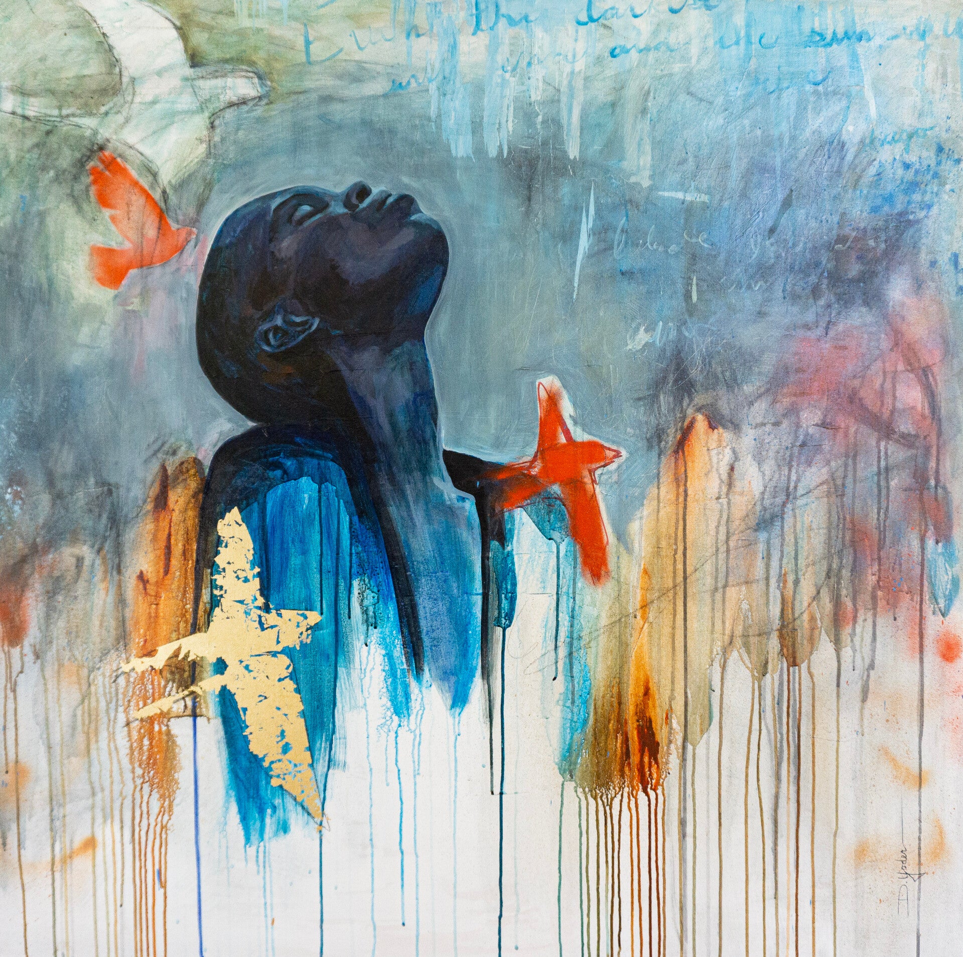48x48" Acrylic and Oil painting on gallery wrapped canvas. Includes gold leafing.